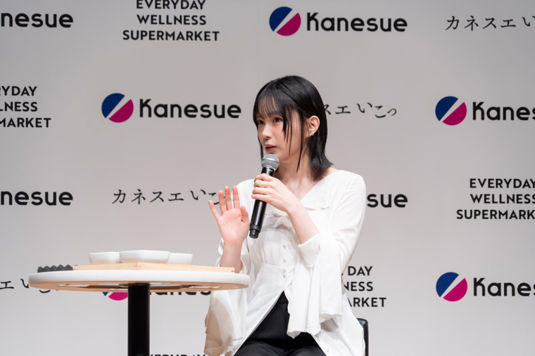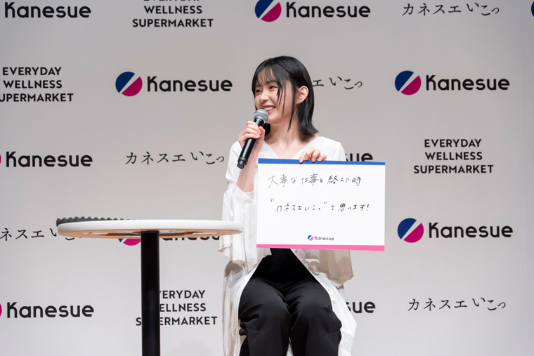 CMの見どころについては「“カネスエいこっ”の言い方をそれぞれで少し変えてみたり、様々なパターンで表現したので注目してほしいです」と語る。また、「どんなときに“カネスエいこっ”と思うか」という質問には、フリップを用いて回答。普段の生活の中で自然とカネスエを思い浮かべるシーンを紹介し、「大事な仕事を終えてご褒美として甘いものを食べたくなると“カネスエいこっ”と思います」と生活の一部としての存在であることを体現した。