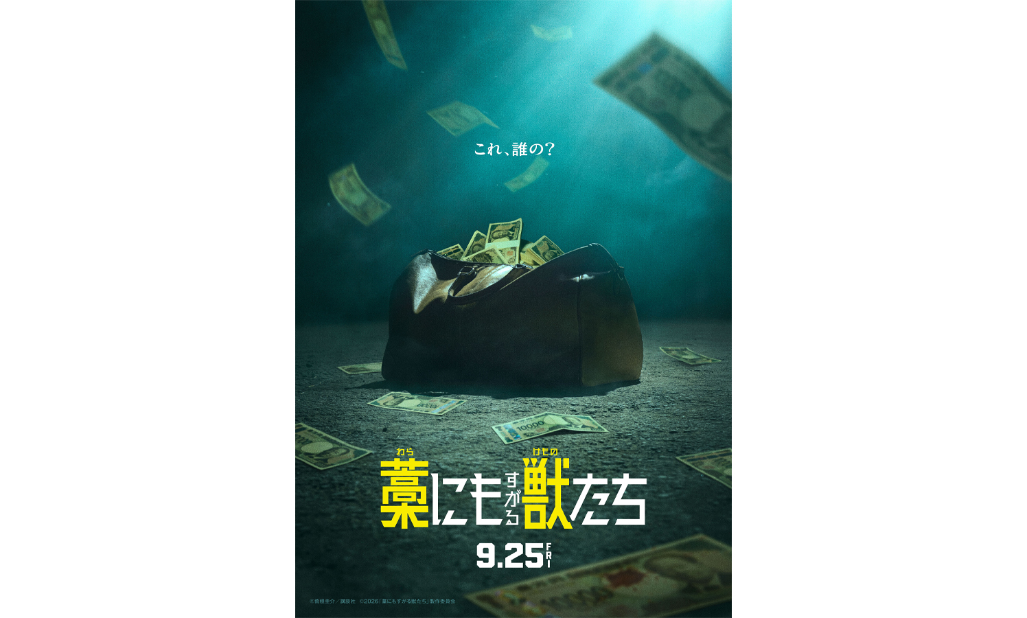 この度、解禁された超特報映像とコンセプトビジュアルに印象的に切り取られているのは、大量の札束がはみ出たボストンバッグ。大金についつい心が動いてしまいそうだが、映像には、何者かが持ち主不明の不審なカバンを探る様子が映し出されている。ビジュアルに刻まれた「これ、誰の?」というコピーも得体のしれなさを感じさせ、果たしてここからどんな金の “獣”たちが登場し運命が交錯してゆくのかー早くもワクワクが止まらない映像とビジュアルになっている。