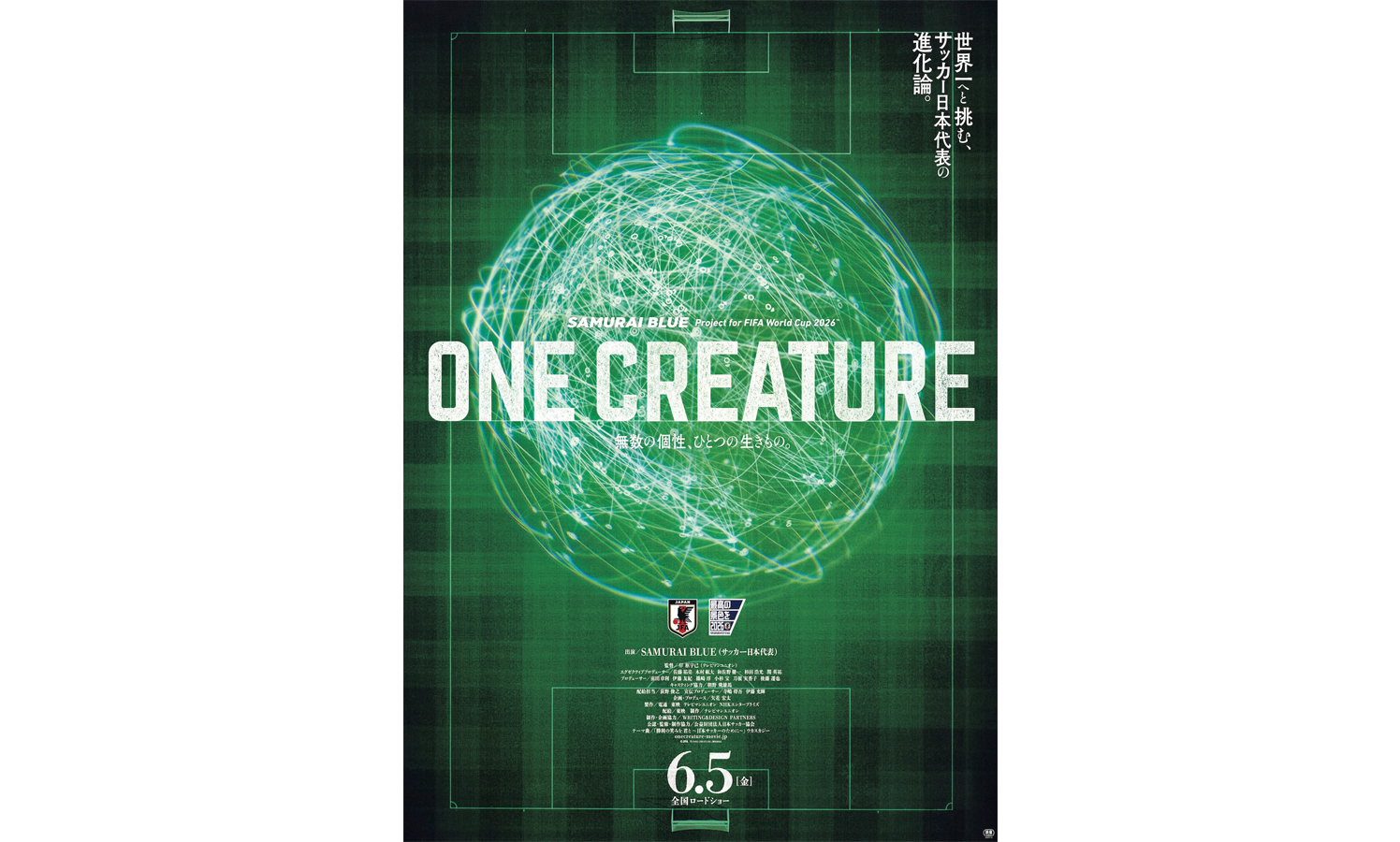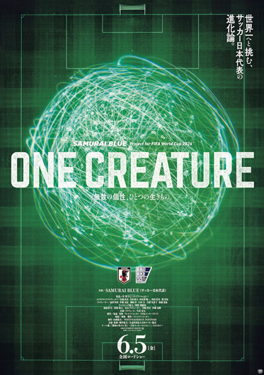 本ポスタービジュアルは、ダイナミックに映し出されたサッカーのピッチ上に、選手たちの動きを示したパフォーマンスデータが無数につなぎ合わされた、非常にインパクトあるものとなっている。『ONE CREATURE 無数の個性、ひとつの生きもの。』のタイトル通り、勝利のためにピッチを駆け回る選手たちの動きが、やがて“無数の個性”として連なり合い、一つの大きな生き物のようになっていく。まさに、日本代表のチームとしての結束力の強さを存分に感じさせるものとなっている。