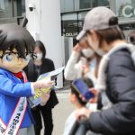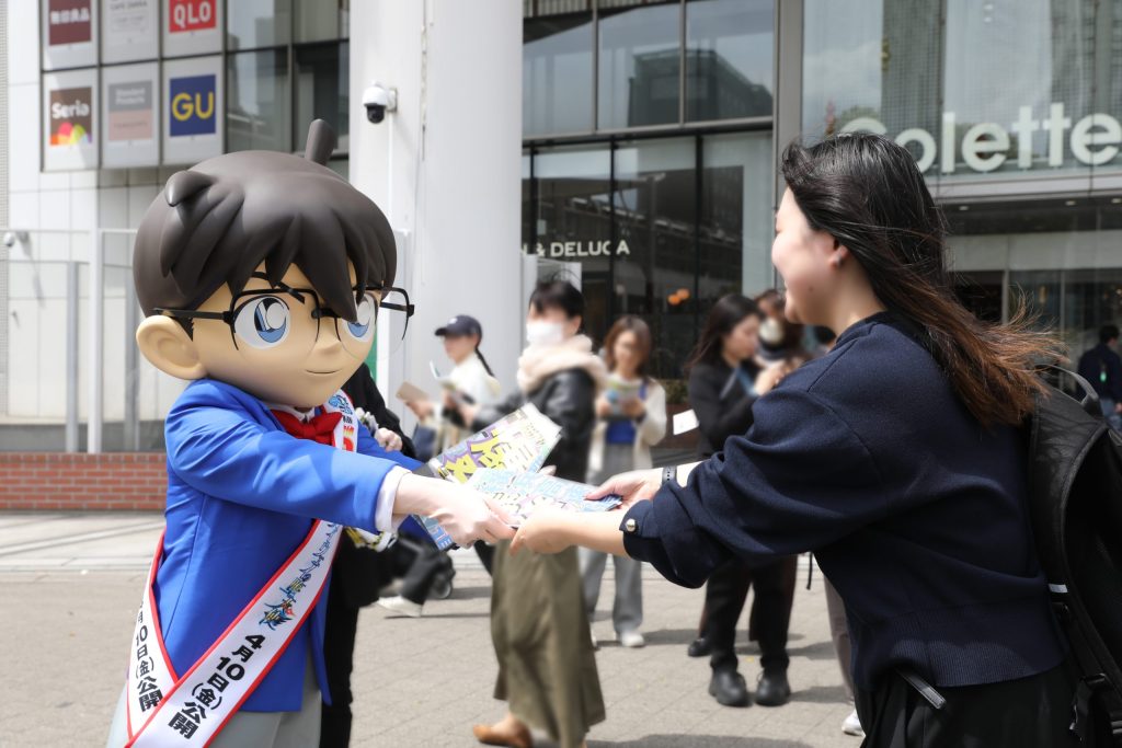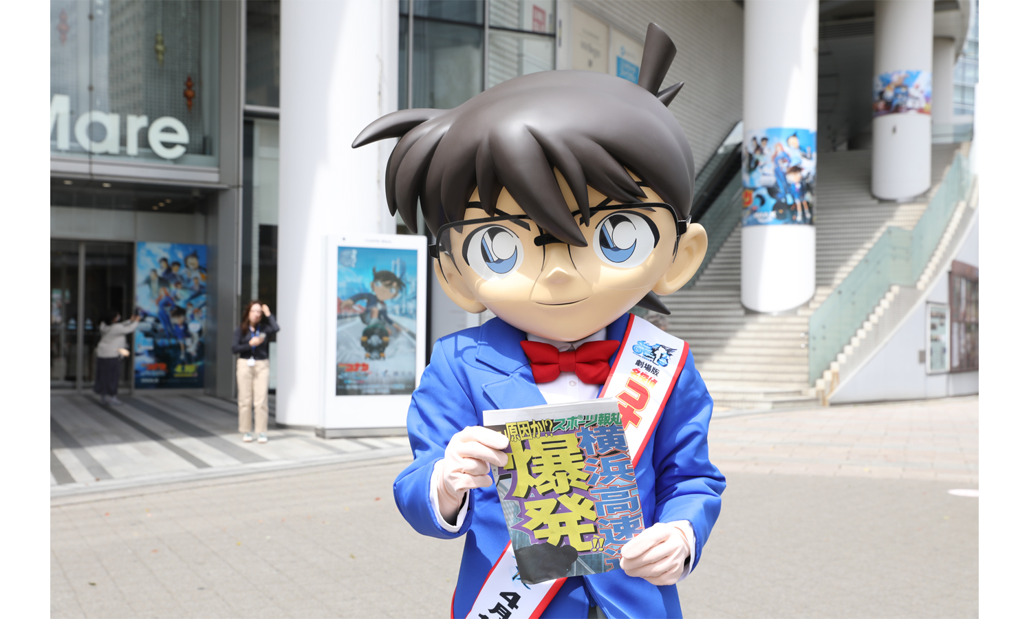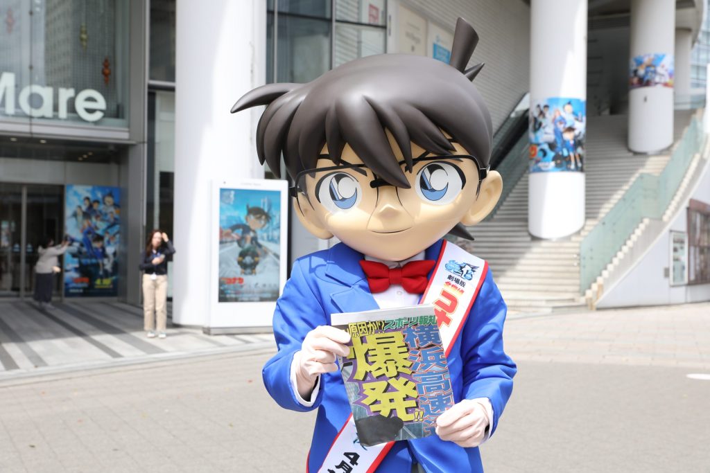 さらに現地にはコナン君もサプライズ登場しゲリラ配布!風の女神がコナン君を歓迎するかのように強い風が吹くなかコナン君が号外を配り始めると、その姿に気が付いた道ゆく人々からは驚きの声があがり、あっという間に号外を求める列が連なった。老若男女問わず多くの人が立ち寄り、コナン君が小学生に囲まれる場面もあるなど大盛況!号外を受け取った20代の女性はコナンの大ファンだといい「号外が配られているとは知らず、偶然桜木町駅に来たらコナン君がいたので、走って号外をもらいにきました!ハイタッチもしてもらえて感激です!今年の映画も何回観ようか悩んでいるくらい楽しみです!!」と、高揚感を露わにした。さらにコナン君が配る号外を手にした横浜在住という親子も「毎年、家族や友達と劇場版を観ています。今年は横浜のどこが爆発されるのかワクワクしています…!!」と、明日公開の本作への想像を膨らませた。