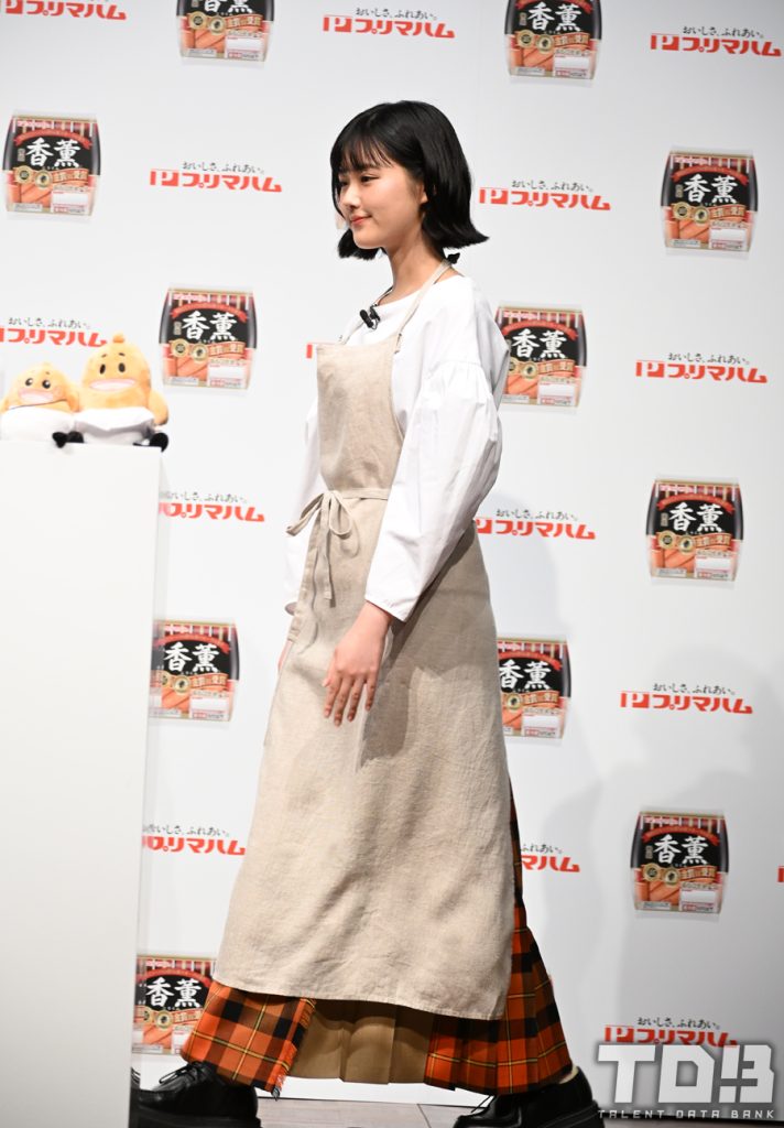 新CMキャラクターを務める原が『香薫』カラーのスカートを身に纏ってあらびき星人・ソップリンと仲良く登場。発表会ではそんな原が“香薫王道炒め”に挑戦する場面もあった。