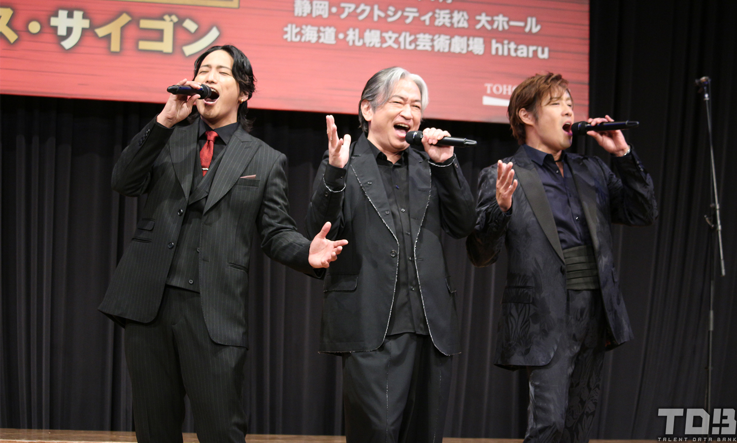 その後に行われた製作発表記者会見では、エンジニア役のトリプルキャスト、駒田一、東山義久、桐山照史、運命に翻弄されるベトナム人少女・キム役のトリプルキャスト、屋比久知奈、清水美依紗、ルミーナをはじめ、プリンシパルキャストが登壇。