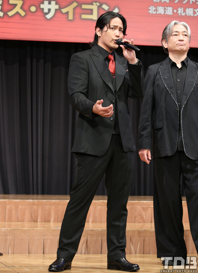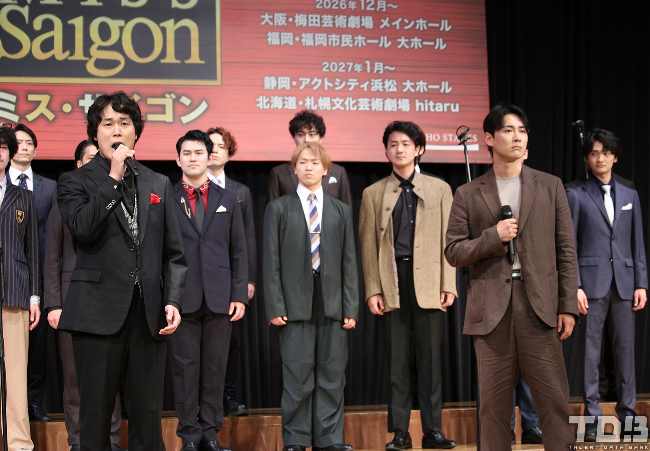 そして、本作が初参加であるエンジニア役の桐山は「先輩方が作り上げてきた『ミス・サイゴン』に入らせてもらう緊張感、『ミス・サイゴン』のファンの人もたくさんいるのは分かっています。その方々に2026年版を観てもらって、楽しかったな、また観たいなと思ってもらえるよう、色んなキャストの組み合わせがあると思いますけども、僕のエンジニアも観ていただいて、良かった、また観たい、これからも頑張れ、と思ってもらえるようなエンジニアを全力で努めさせていただきたいと思います」と気合を入れ、「大体こういう時って迷惑かけないように頑張りますっていうのが普通だと思いますが、迷惑かけます!すいません!先に謝ります!お願いします!全力で一さんや東山さんに甘えながら、桐山の出せる100%、150%の力で頑張りたいと思います!」と力強くコメント。