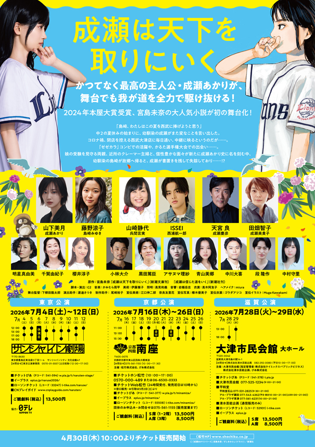舞台版『成瀬は天下を取りにいく』は、主人公・成瀬あかりが全力で我が道を突き進む姿が読者を魅了し、2024年の「本屋大賞」はじめ数多くの文学賞を受賞した宮島未奈のデビュー作『成瀬は天下を取りにいく』(新潮文庫刊)と続編『成瀬は信じた道をいく』(新潮社刊)を原作に構成。シリーズ累計発行部数210万部を突破する大人気作は、周囲におもねることなく自由に生きる成瀬あかりの姿や、成瀬に影響を受けて新しい生き方を見つけていく人々の姿を生き生きと描き、滋賀県大津市を舞台にした新たな青春小説として、世代を超えた多くの読者の心を捉えている。