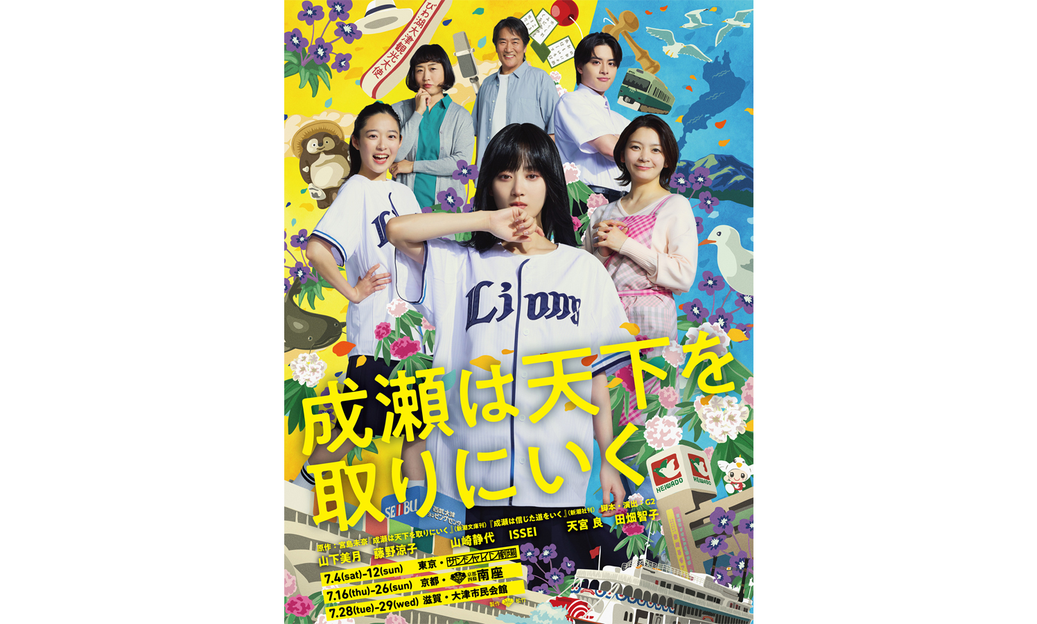 この度解禁されたビジュアルには、山下美月演じる成瀬あかりが中心に立ち、原作『成瀬は天下を取りにいく』の表紙を飾るざしきわらし氏による成瀬あかりのイラストを彷彿とさせ、その存在感を放っています。強い意志を感じさせる瞳は、まさにわが道をいく成瀬あかりそのもの。成瀬を囲むのは、島崎みゆき(藤野涼子)、呉間言実(山崎静代)、西浦航一郎(ISSEI)、成瀬慶彦(天宮良)、成瀬美貴子(田畑智子)ら、成瀬が紡ぐ“成瀬あかり史”を間近で見守る人物たち。それぞれのキャラクターの性格や個性を出しながらも、時にはよき理解者として成瀬を支える様子を表現している。