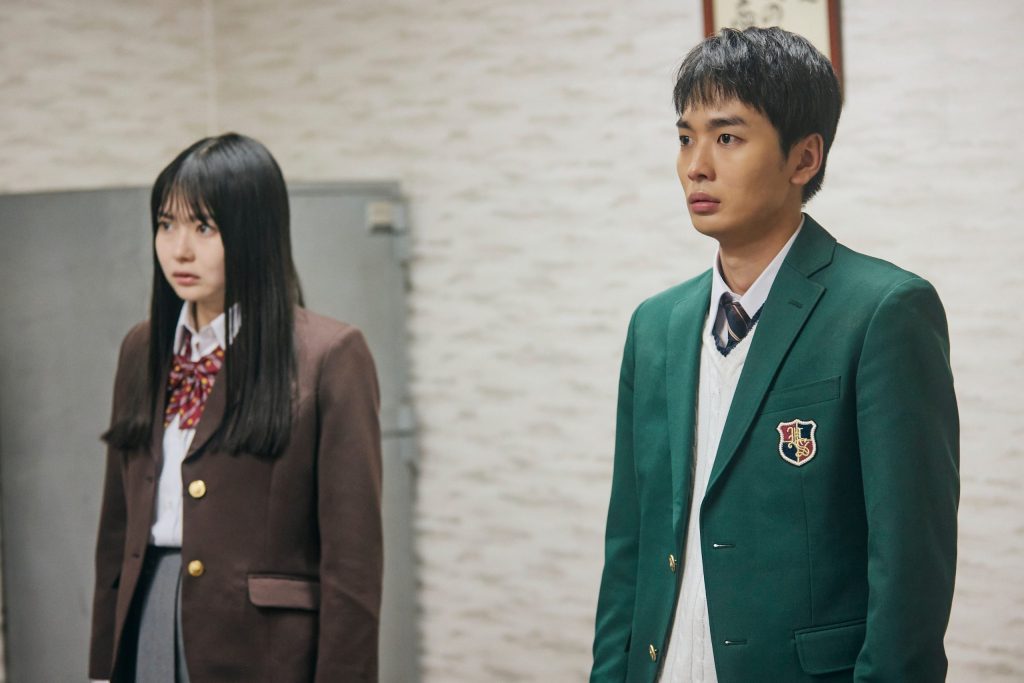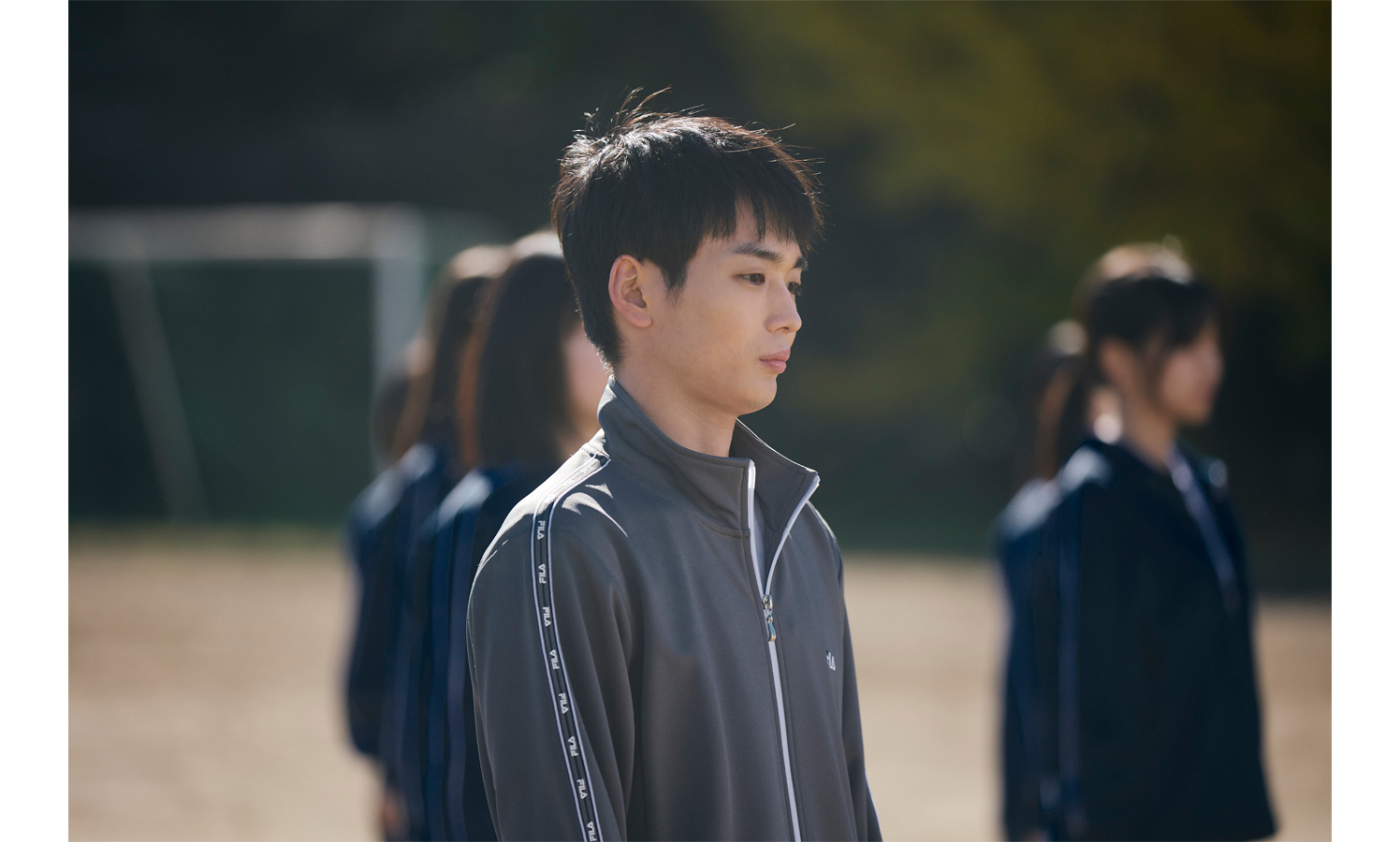 今回解禁された場面写真では、周囲の顔色を伺わず自分を貫く、優のキャラクター性が際立つ印象的なカットが収められている。体育の授業で集団行動を練習する中、一人号令のタイミングに合わせられず注意され、不服そうな表情を見せるカット。クラスメイトたちが洗脳されたかのように人間ピラミッドに加わっていくのを制止しようと、教師と対立するカット。さらに、集団を率いる校長(ピエール瀧)と校長室で対峙する場面では、目の前で繰り広げられる異様な光景に言葉を失いながらも、冷静に状況を理解しようと鋭い眼差しを向けるカット。そして、家族にも問題を抱え、どんどん追い詰められていく愛を背負い、家に送り届ける姿など、愛に苛立ちを感じながらも、放っておけない、そんな不器用な関係性もまた青木の“沼”にハマる見どころの一つだ。